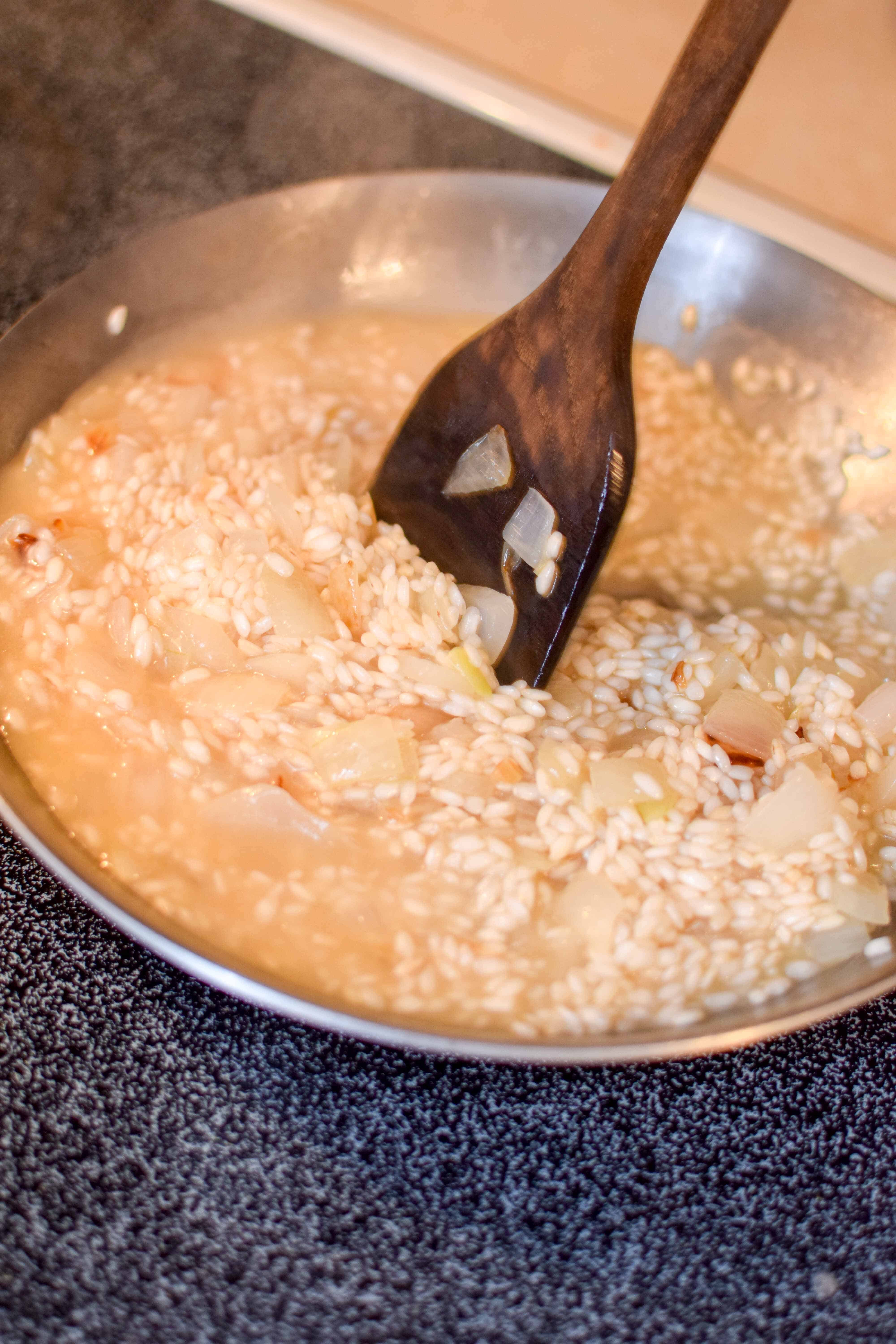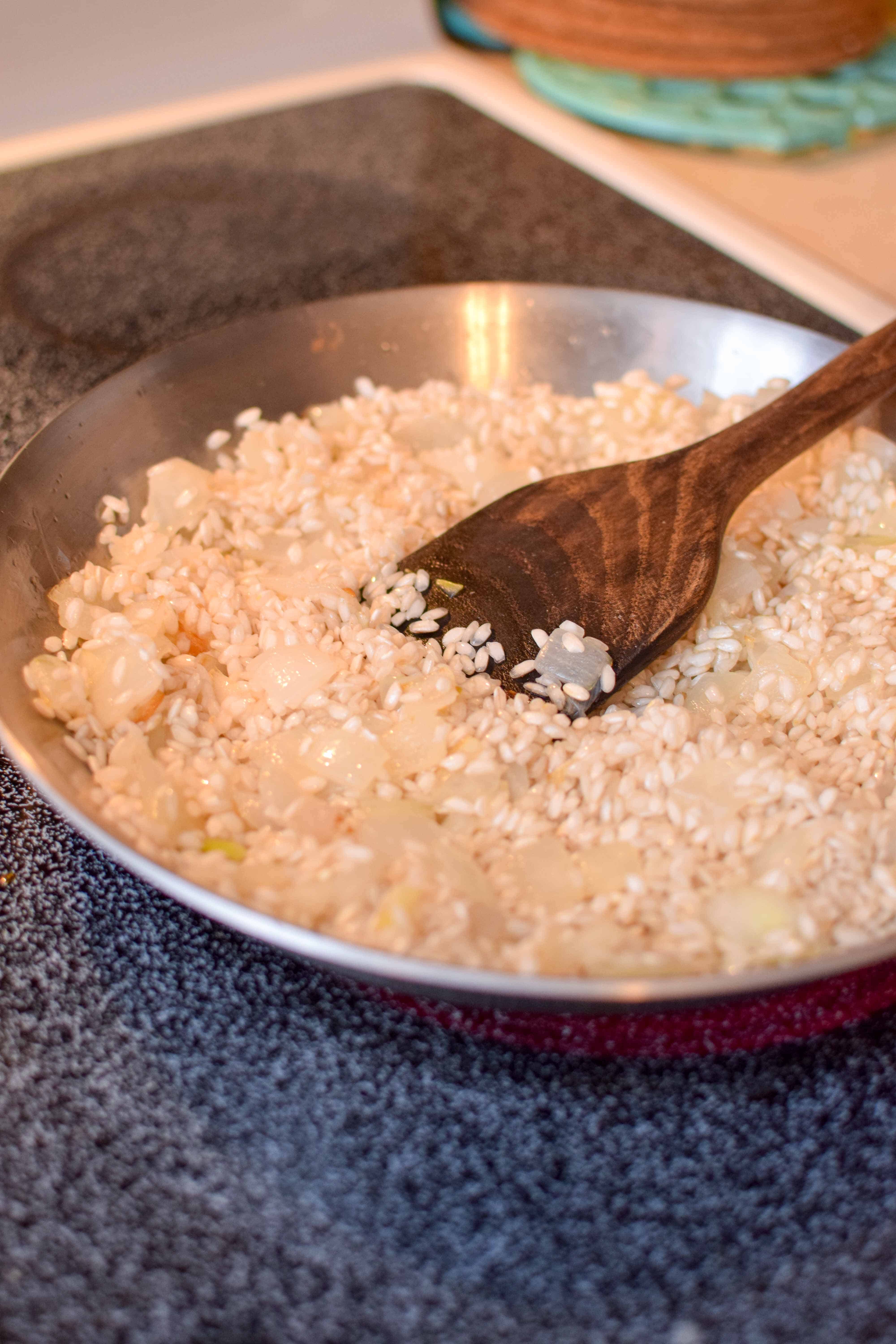 - On medium-low heat, add rice to the diced onions and cook for about 2-3 minutes, stirring constantly.