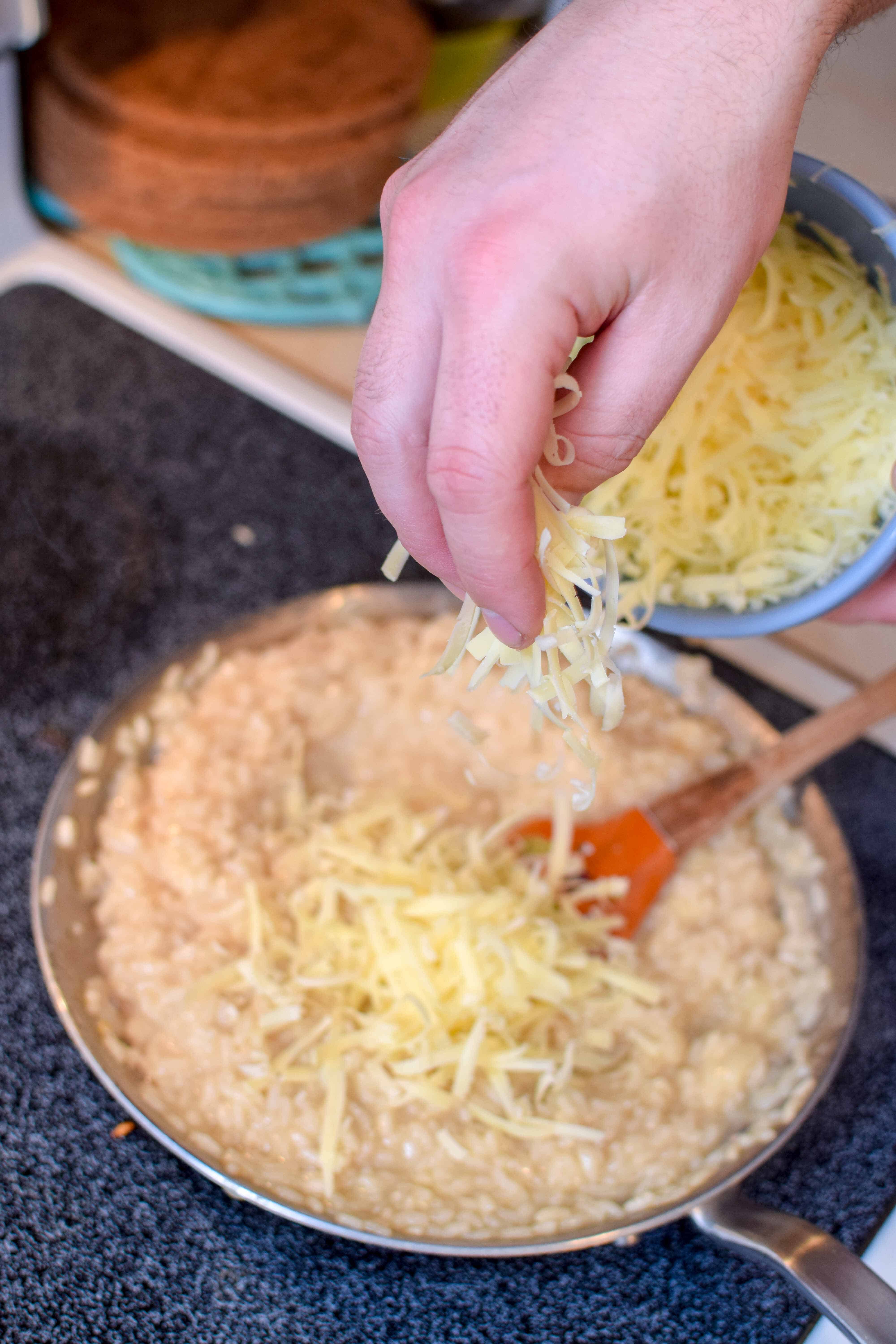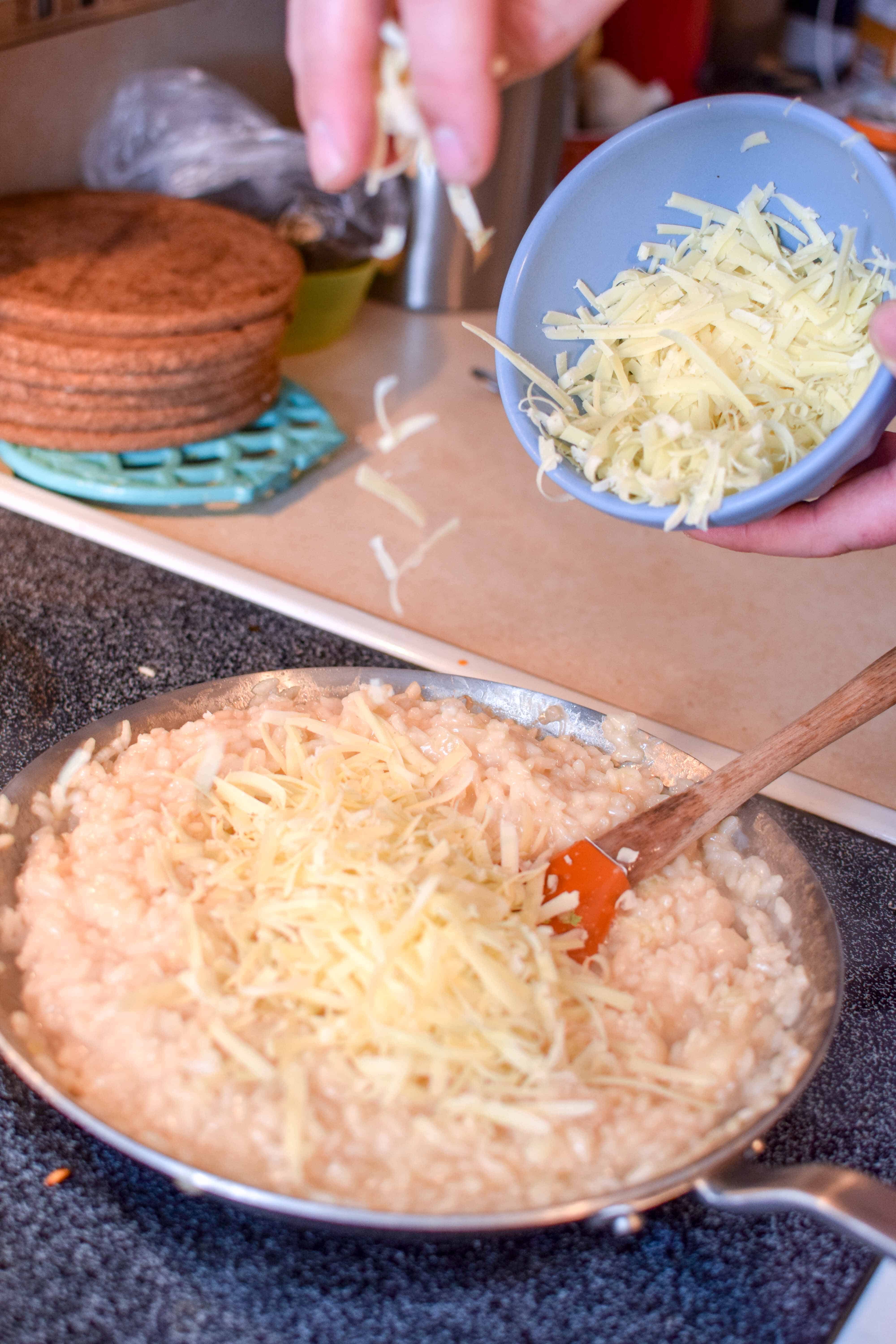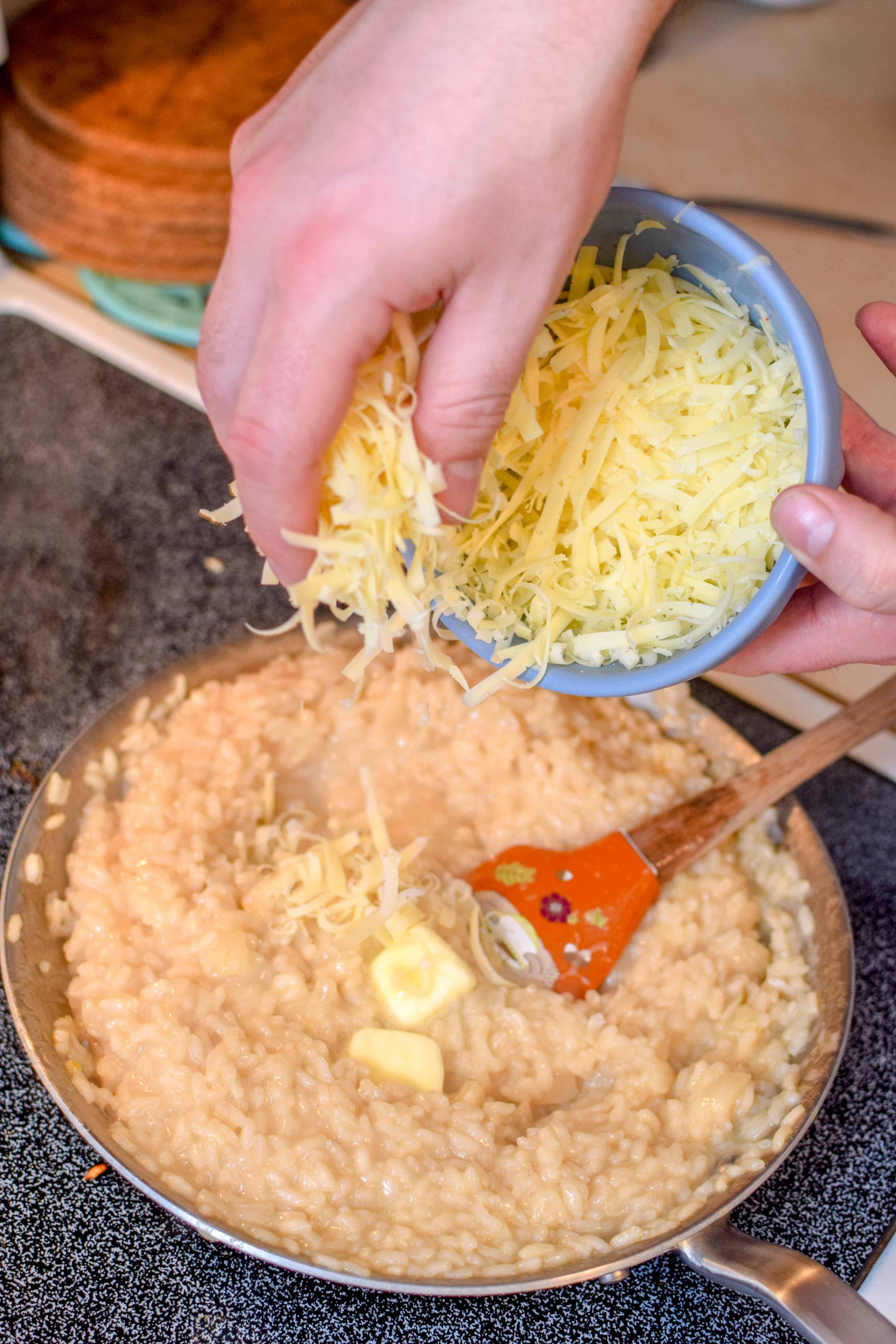 Now for the BEST part, adding the Mahón-Menorca cheese to make this a super cheesy risotto! You add the cheese once your rice is basically done and then just stir, stir, stir until it is totally combined and perfect. Oh, and you add butter, because duh.