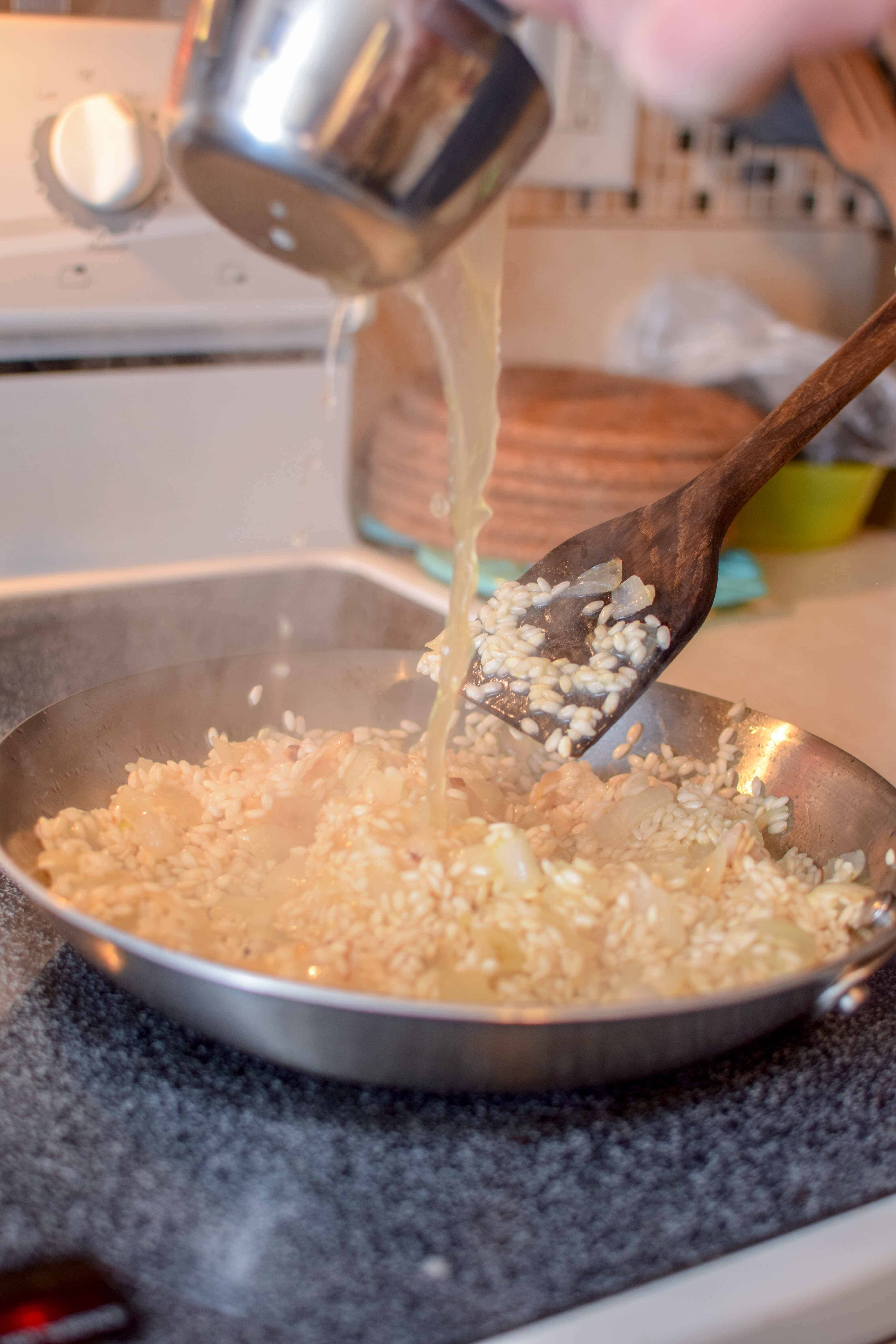 - Add chicken broth to a stock pot and bring to a boil, then turn to low and simmer until ready to pour into risotto.